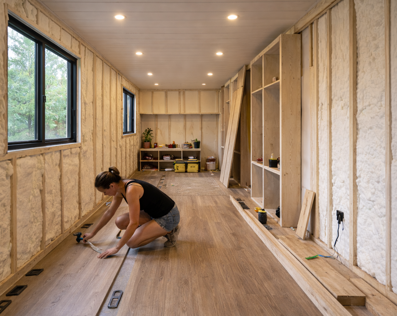 La parte más asombrosa de esta transformación está en el interior del contenedor. Aquí es donde el cambio de verdad cobra vida y donde todo encaja. Pasa a la siguiente página para ver el resultado final. Cuesta creer que sea el mismo contenedor.