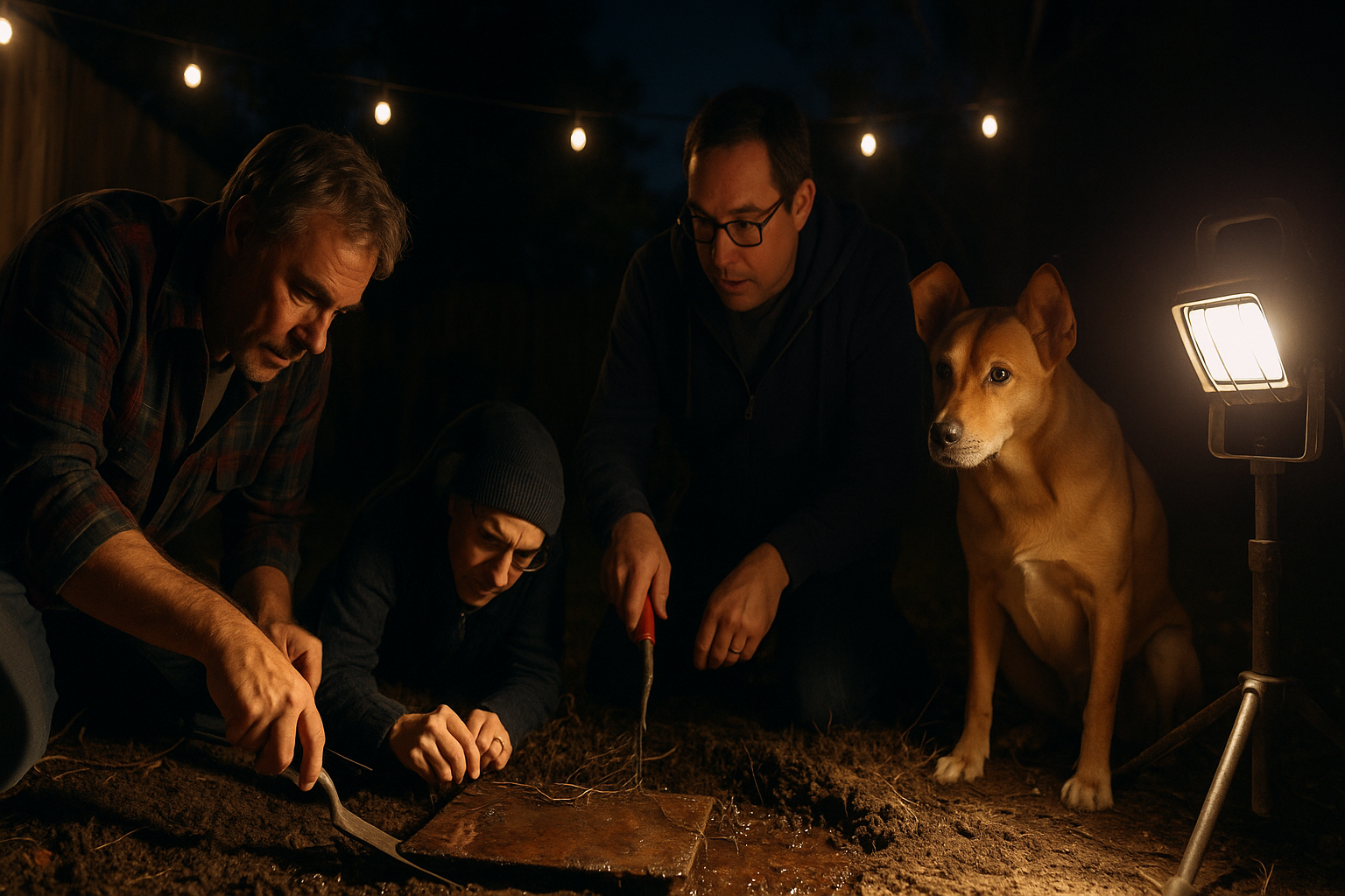 Siguieron el contorno hasta encontrar un pequeño asa cubierta de tierra. Henry metió la palanca por debajo y empujó. El suelo soltó un silbido cuando escapó el aire, con olor a piedra húmeda y lluvia antigua. No era gas ni alcantarillado. Era algo más viejo. Llamaron a la línea de emergencias no urgentes. La operadora preguntó si parecía peligroso. Henry respondió que no lo sabía, solo que no debía estar allí. Mandó a un agente para vigilarlo durante la noche. El perro se tumbó junto al agujero, con el hocico apoyado en el borde, custodiando su tesoro enterrado.