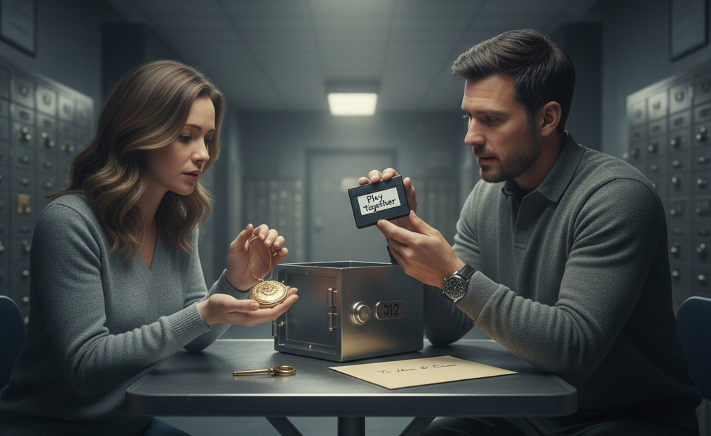 A la mañana siguiente, se sentaron en una tranquila cámara del banco. La caja 312 se abrió con un clic. Dentro había una carta sellada con sus dos nombres y un pequeño relicario que parecía cálido al tacto. En la cinta se leía: “Reproducid juntos”.